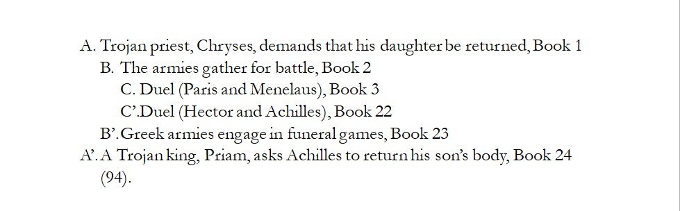 The unifying narrative structure throughout the Iliad is a device interchangeably called “ring composition” by some critics and “chiastic arrangement” (after the Greek letter χ, the chi) by others. The narrative that employs ring composition comes “full circle” in the sense that its end was sufficiently foreshadowed by the beginning of the tale, which essentially returns to the point at which it began. The necessities of plot, even for an epic tale, demand progress and movement, so the nature of the return or completion is sometimes more symbolic than literal, but this does not detract from the efficacy of this narrative technique. This pattern pervades the Iliad in each facet of its structure, from the overarching schema of the entire work to the order of scenes within individual books.