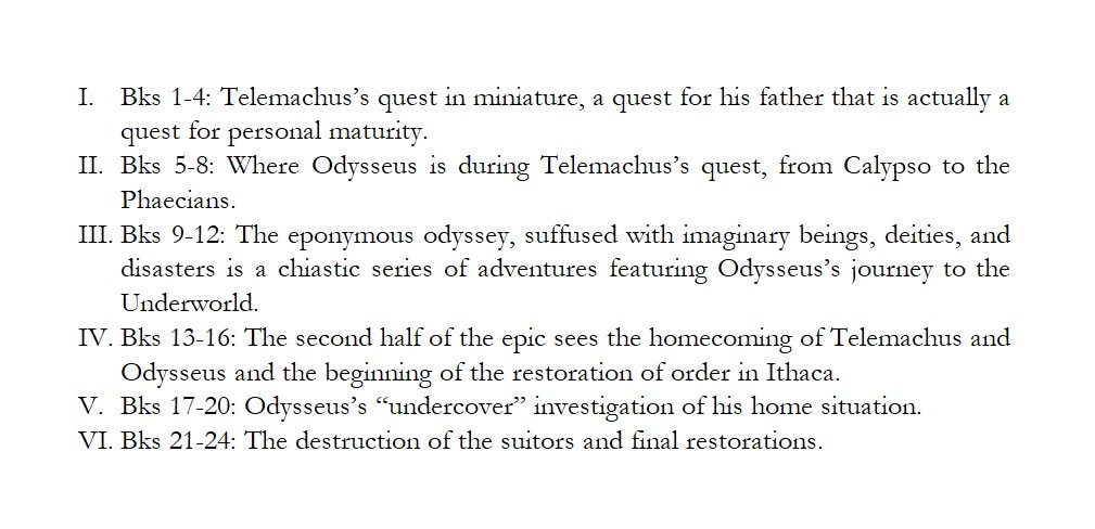 Unlike the Iliad, the Odyssey does not have the same over-arching ring composition or chiastic structure, though the most famous part of it — Odysseus’s magical journey — does have a loose chiastic arrangement in which each hostile episode is followed by an equally dangerous peaceful episode, all attempting to prevent Odysseus from returning home, according to Leithart (cf. 180-181). This makes sense, as the Iliad is a grand war poem whose characters do not physically go anywhere and the Odyssey is Western literature’s archetypal journey story. The Odyssey is a series of six quartets in the chapter/book arrangement in which the poem exists today. Without belaboring the plot synopsis here, it is possible to define the structure of the epic with another diagram: