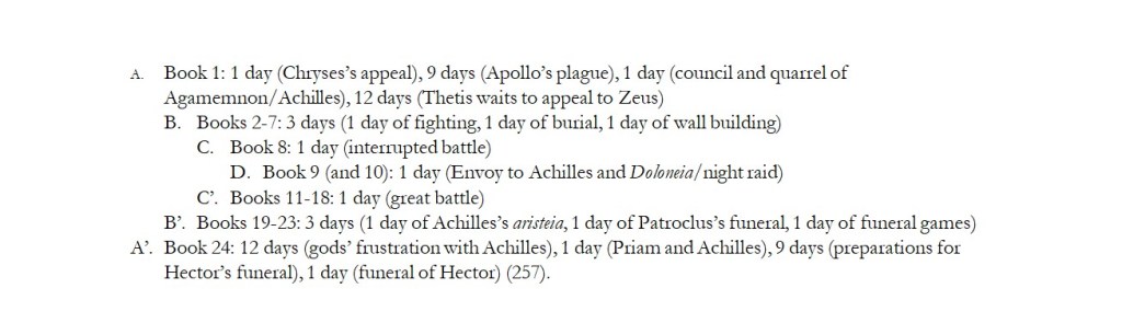 Peter Leithart provides the following diagram, which summarizes many of Cedric Whitman’s ideas about the arrangement of the Iliad: