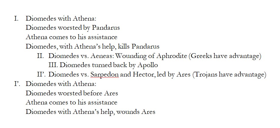 But ring composition does not just inform the overarching structure of the Iliad. It can also be seen in smaller sections within the poem. Book five, relating Diomedes’s mighty battle exploits while Achilles is away from combat, similarly depicts such a pattern in another diagram from Whitman: