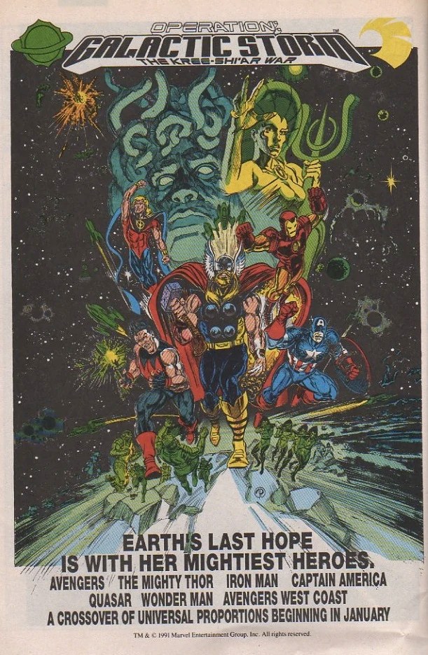 Twenty years now … where’d they go? Twenty years … I don’t know. I sit and I wonder sometimes where they’ve gone. Regardless, twenty years ago, the House of Ideas gave us one of the last truly great crossovers in the Avengers universe: Operation: Galactic Storm. A 19-part maxi-series (not counting the prologue and epilogue issues), Operation: Galactic Storm is an interstellar masterpiece of storytelling precision, daring yet consistent characterization, and climax and dénouement rarely surpassed in what the denizens of Highbrow Street call “literature.” Best of all, perhaps: it’s a great story. I don’t know how 20 years have passed since I first delighted and dismayed through its greatness, but I could tell even then it was truly something rare and wonderful. Even though it is longer than X-Cutioner’s Song, the X-Men crossover we reflected upon last season, it is better paced, has no filler parts, has a larger cast, and tells perhaps a better story on an even larger scale. Let us travel back now to a simpler time and delight ourselves once again (or for most of you, for the first time — a journey you won’t regret, especially if you go out and get the two volume TPB collection to read for yourself) in the magnificence that was, is, and always will be Operation: Galactic Storm.