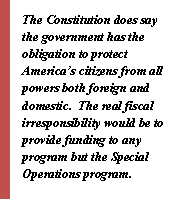 Lastly is the assertion funding and incentives for SOF are fiscally irresponsible and unnecessary, and the funding would be better spent elsewhere in the military or even on programs like government-provided health care. When the safety of America is at risk, other programs such as socialized health care must be put on hold. The government does not, and has never had the responsibility to, provide health care to all citizens according to the U.S. Constitution. The Constitution does say the government has the obligation to protect America’s citizens from all powers both foreign and domestic. The real fiscal irresponsibility would be to provide funding to any program but the Special Operations program. Government funding for the U.S. military was dramatically cut in the beginning of the year 2011. Cutbacks due to the recession cost many in the military their jobs. Congress currently is projecting to cut the military’s overall budget by even more, potentially up to 500 billion dollars. With budget cuts as dramatic as these, America’s military is going to be significantly smaller, thus weakening the defense of America. With America as a super-power turned invalid, other countries won’t hesitate to take advantage of a weakened America and attack. The remaining soldiers guarding our country must be the best of the best, properly trained to fight the changing style of war: Irregular Warfare. Our military must adapt its personnel and tactics in order to not be swept aside by enemies more prepared than America. The soldiers best trained for this warfare are SOF soldiers.